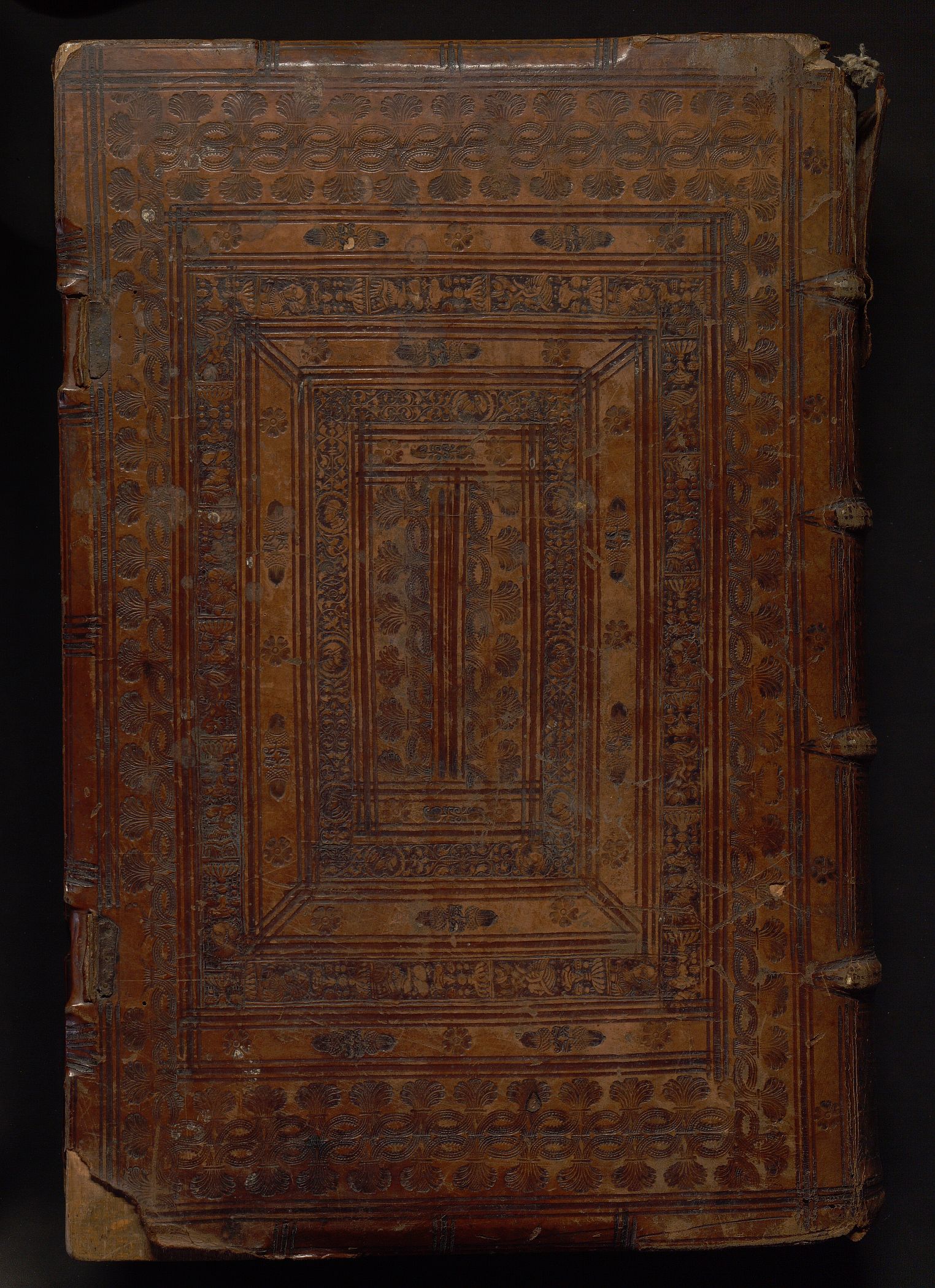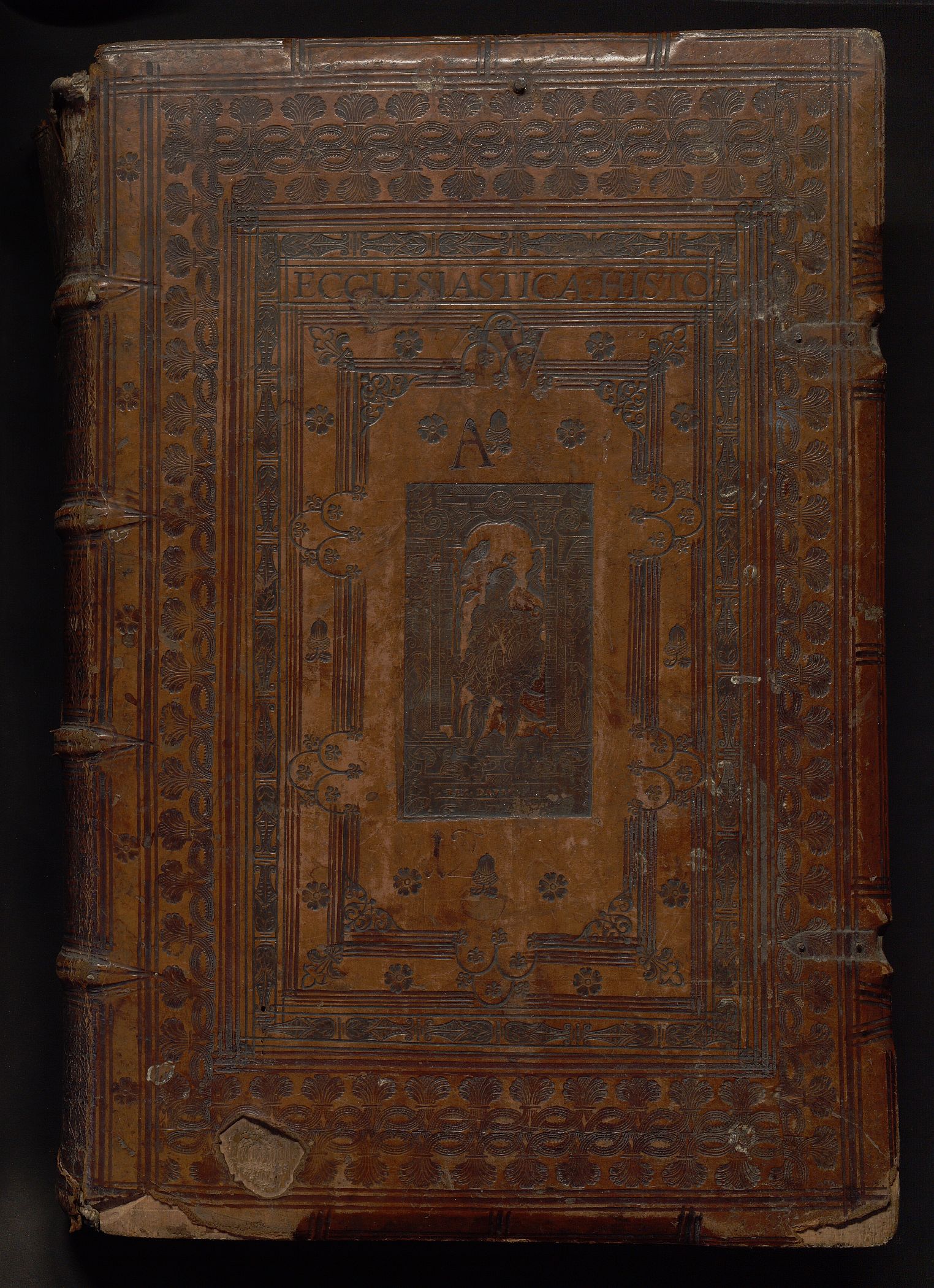 | Oprawa: | oryginalna, deska, skóra brązowa z tłoczeniami ślepymi emblematów roślinnych i geometrycznych, na przedniej okładce wycisk złocony plakietki przedstawiającej Modlitwę króla Dawida oraz wytłoczone: ECCLESIASTICA HISTO[RIA], ślady po zpinkach [II poł. XVI w.]. |