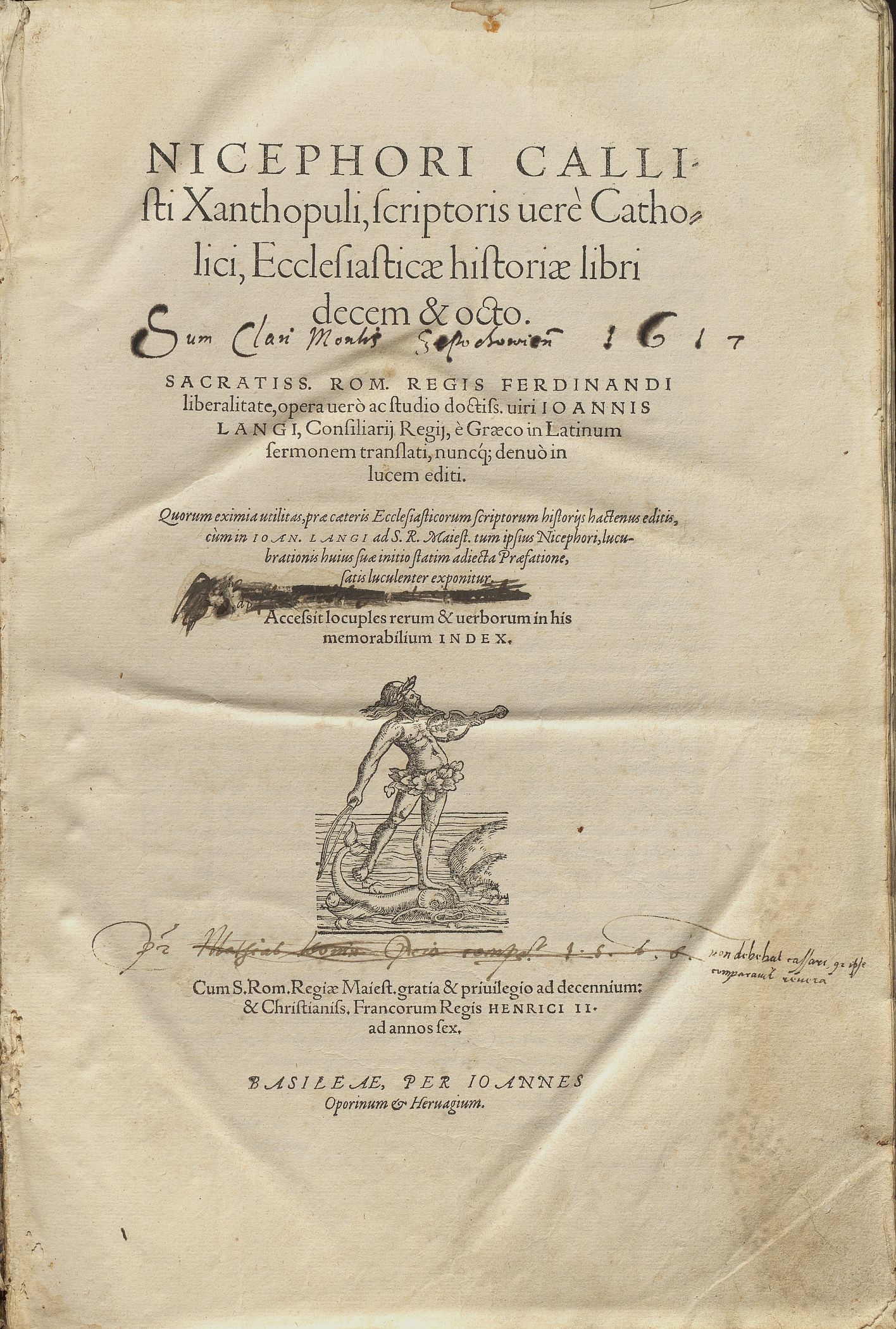 Nicephori Callisti Xanthopuli, scriptoris uere Catholici, Ecclesiasticae historiae libri decem & octo. […] opera uero ac studio […] Ioannis Langi Conciliarij Regij e Graeco in Latinum sermonem translati, nuncq[ue] denuo in lucem editi.